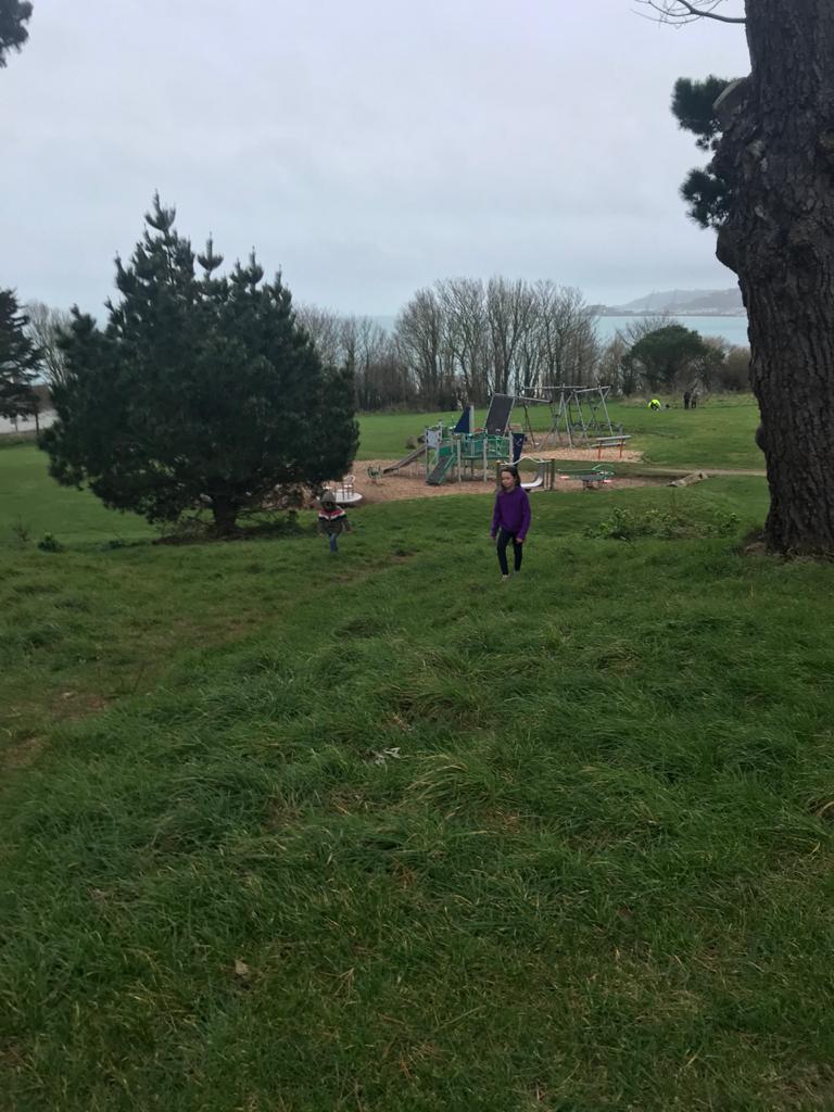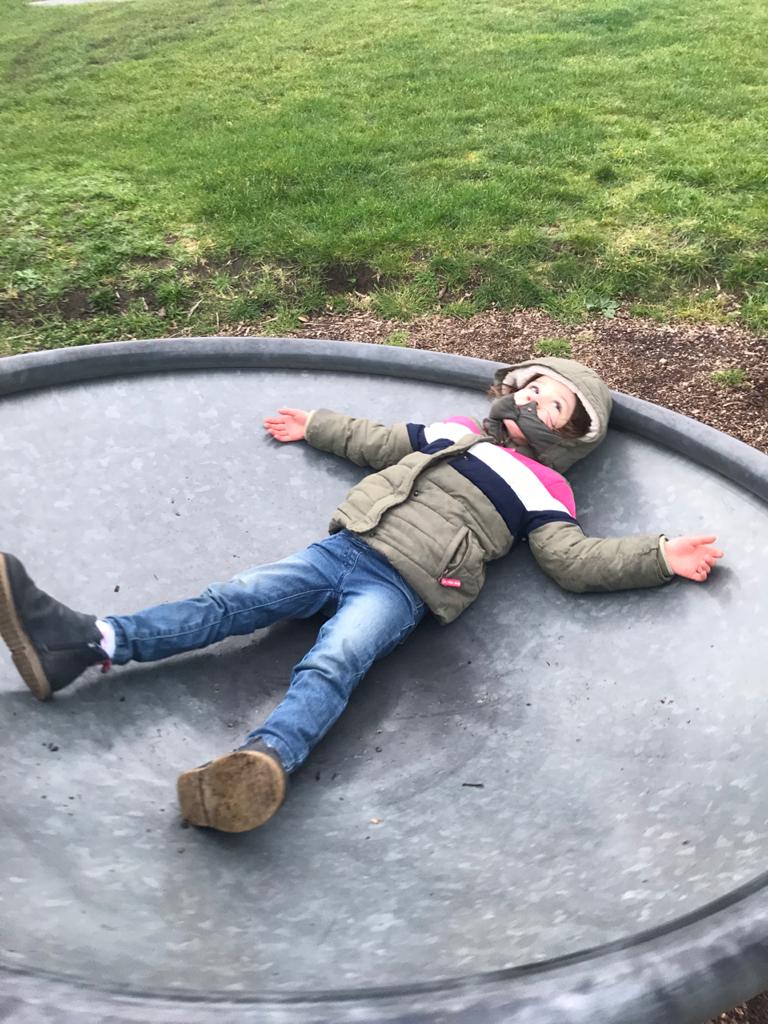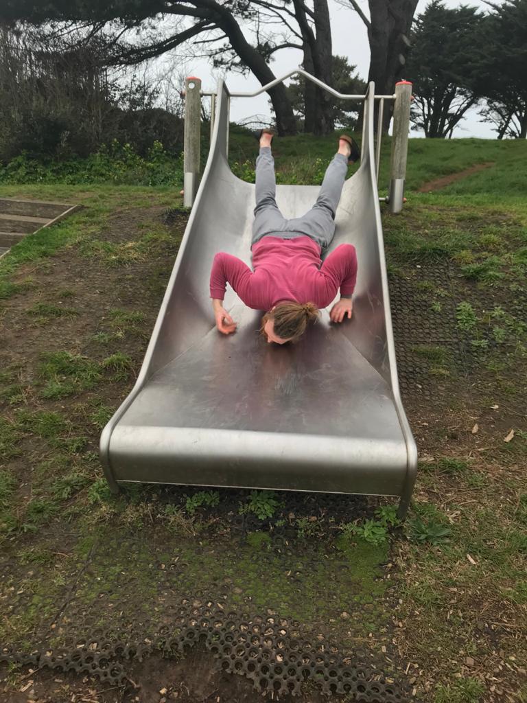Meanwhile, my youngest niece, two-years-old, is going down the metal slide. It’s too frictious a material to get a good whizz out of it, as both I and my niece soon discover.